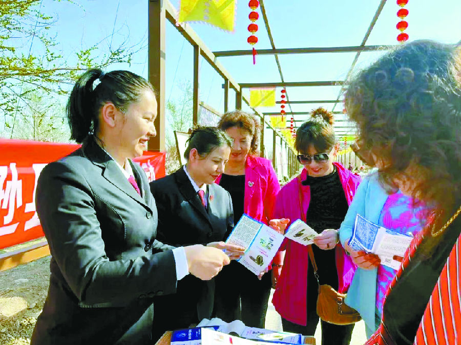 检察官向赏花群众发放防范非法集资、司法救助、检护民生等相关宣传册,引导群众尊法学法守法用法。 祖丽米热·西日甫 摄