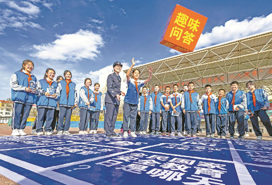 4月12日,在第九个全民国家安全教育日来临之际,新疆出入境边防检查总站昌吉边境管理支队民警走进昌吉市第三中学,通过趣味问答游戏宣传国家安全知识。 何龙 摄