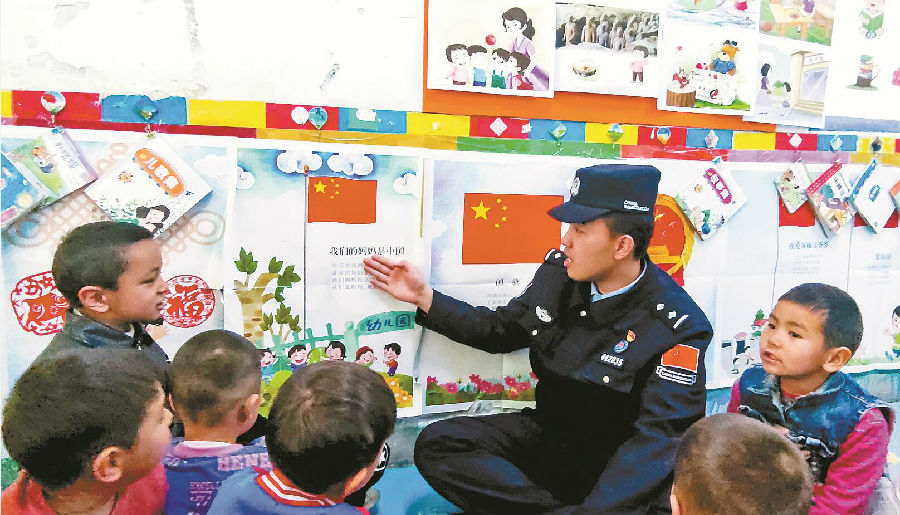 4月11日,新疆出入境边防检查总站克州边境管理支队依达良边境派出所民警走进辖区小学,开展国家安全教育进校园活动。 缪应传 摄