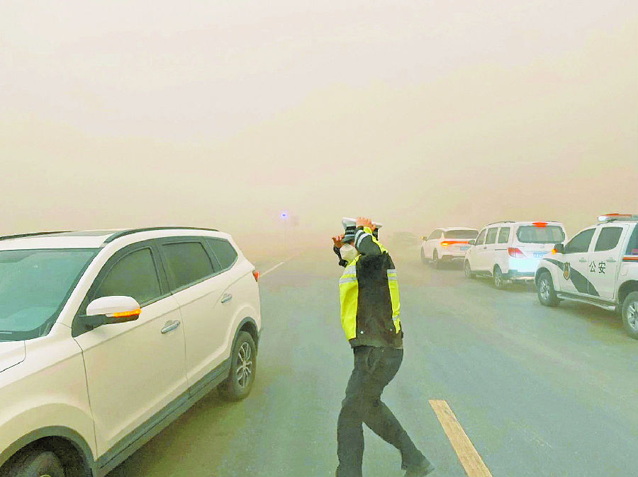 图为哈密市公安局交警支队民警在沙尘中引导车辆通行。 齐文娟 摄