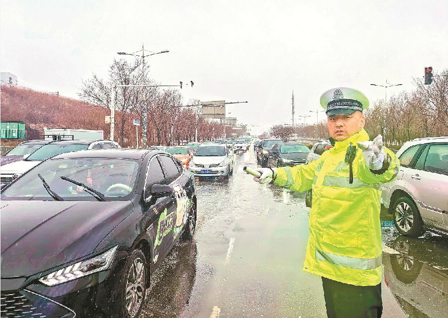 4月17日,乌鲁木齐市公安局交警支队经济技术开发区(头屯河区)大队民警在雨中指挥交通。当日,乌市持续降雨,路面湿滑,行车视线受阻,为确保道路交通安全、畅通、有序,乌市公安局交警支队启动恶劣天气应急处置预案,科学调配警力,为群众出行安全保驾护航。 石榴云/新疆法治报记者 单坤 摄
