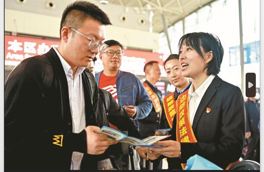 A+ | a4月26日,自治区边防委员会办公室工作人员向旅客宣传《中华人民共和国出境入境管理法》。当日,自治区边防委员会办公室联合新疆出入境边防检查总站,在乌鲁木齐地窝堡国际机场开展以“树牢法治理念,依法管边治边”为主题的边防政策法律法规宣传活动,工作人员向旅客讲解《中华人民共和国陆地国界法》《新疆维吾尔自治区边境管理条例》等法律法规,提高群众守法护边的自觉性。石榴云/新疆法治报记者 单坤 摄