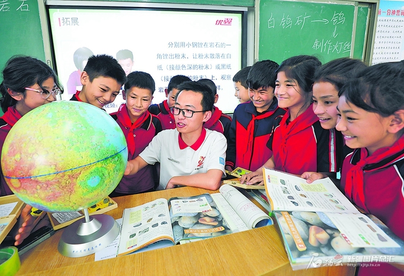 4月30日,支教服务队教师给学生讲解课外知识。2017年以来,自治区团委每年选派西部计划大学生志愿者和支教老师来到和田县塔瓦库勒乡巴克墩村小学开展支教帮扶,该校教学质量得到明显提升。 许晓龙摄