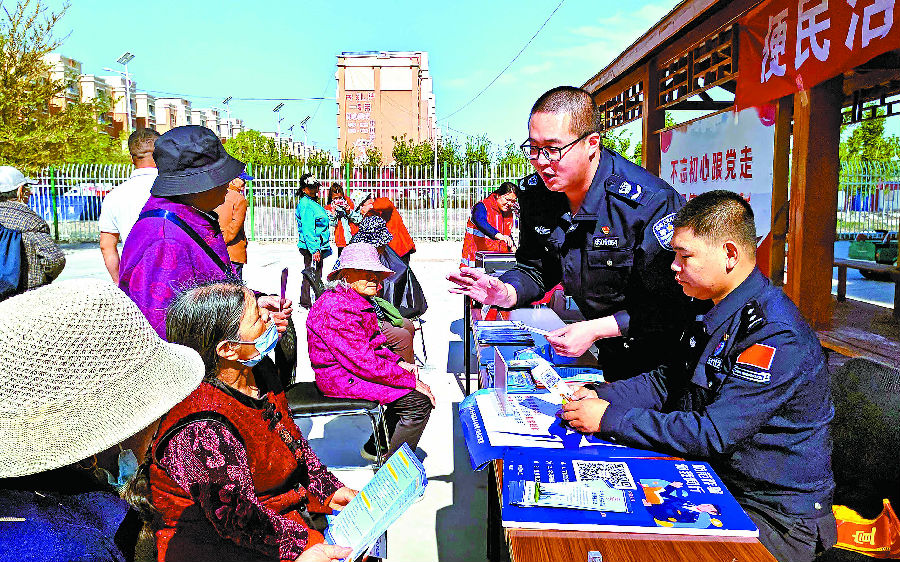 4月30日,兵团第五师九十团司法所联合团场医院以及基层派出所、社区志愿者在艾比湖社区开展“普法+义诊”活动。