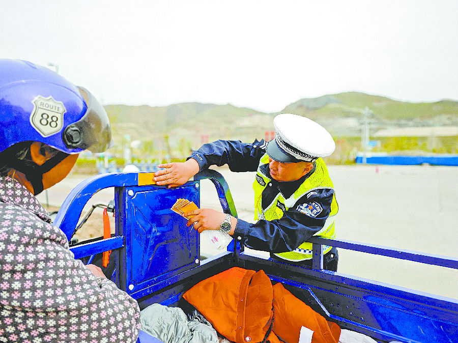 活动期间,民警联合各乡(镇)派出所在国省道沿线村庄路口设立交通安全劝导站,通过发放宣传资料及面对面宣讲等方式,引导摩托车和电动自行车骑乘人员自觉佩戴头盔、汽车驾乘人员规范使用安全带,拒绝酒驾毒驾、超员超速、疲劳驾驶等交通违法行为。同时,针对反光标识不清晰、老化、不完整的农用车、电动三轮等车辆,民警主动粘贴反光贴,切实消除安全隐患,受到群众广泛好评。 哈马什·苏肯 摄
