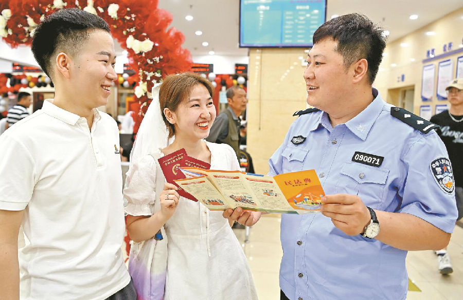 5月20日,乌鲁木齐市公安局沙依巴克区分局民警向新人宣传民法典。