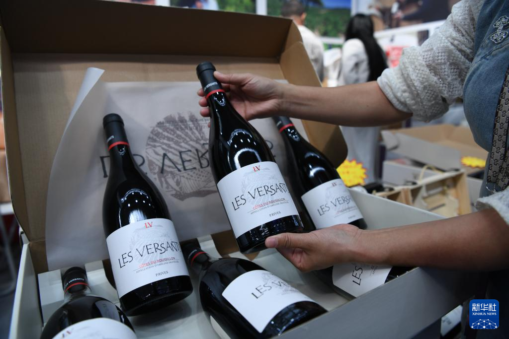 5月20日,在第八届中俄博览会上,参会人员展示一款法国的红酒。新华社记者 王松 摄