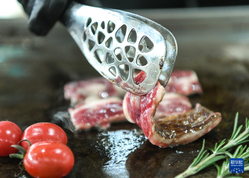 5月19日,在第八届中俄博览会上,参会人员在煎制高品质雪花牛肉。新华社记者 王松 摄