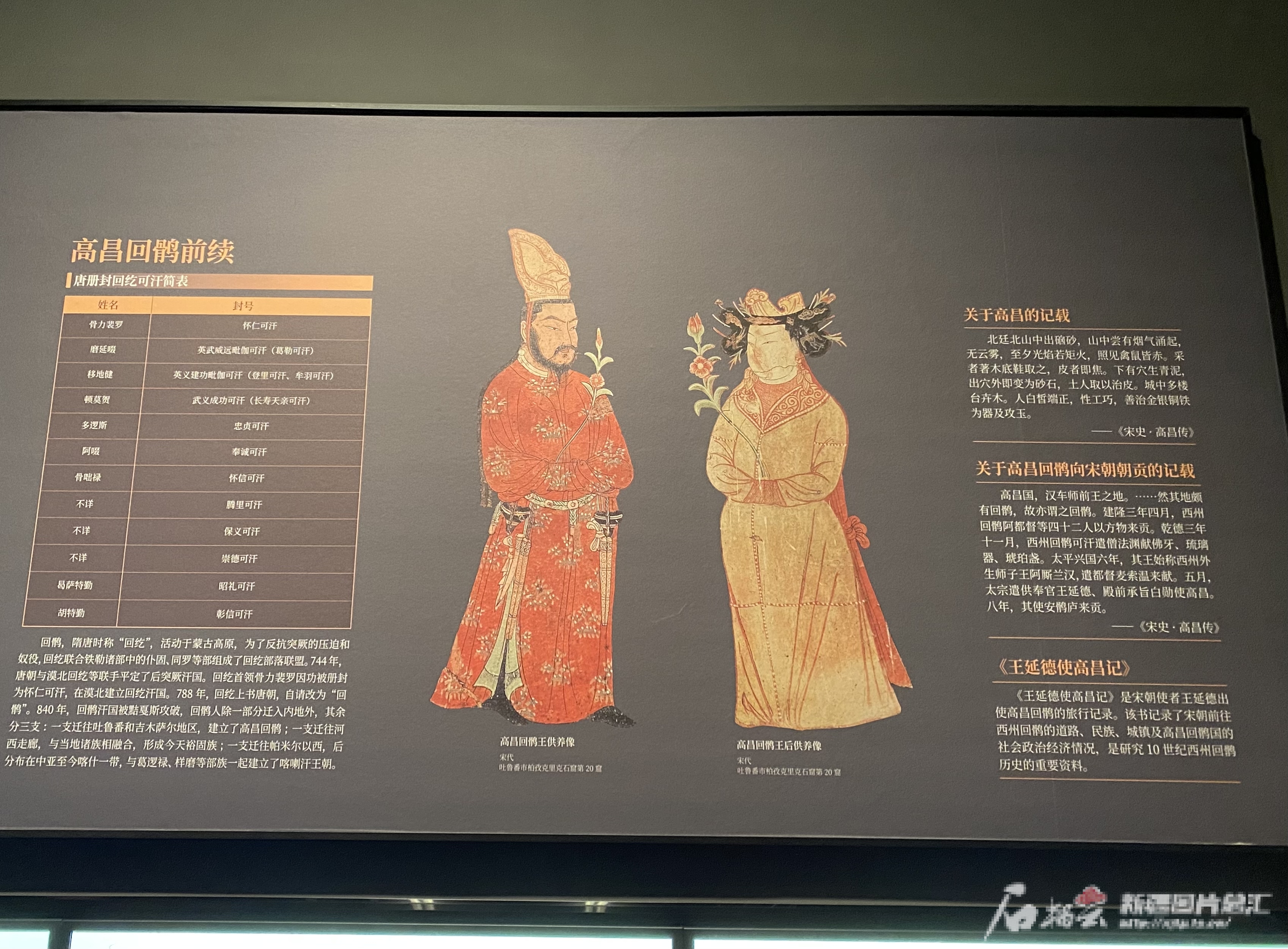 新疆博物馆有对文创“明星”——“小智”和“小慧”,它们身着红袄,外型呆萌可爱,深受游客喜爱。这一系列文创,取材于柏孜克里克千佛洞遗址第20窟壁画中的高昌供养人形象。而这幅壁画的高清图片,就陈列于新疆博物馆二楼的历史文物展厅,壁画中的高昌供养人峨冠博带,雍容华贵,看上去高冷又严肃,与“小智”“小慧”反差强烈。