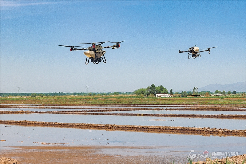 5月16日,在新源县“水稻第一村”肖尔布拉克镇喀克村稻田上空,无人机在飞播稻种。近年来,该县不断提升科技强农服务能力,实现了水稻种植全程机械化。□张文庭摄