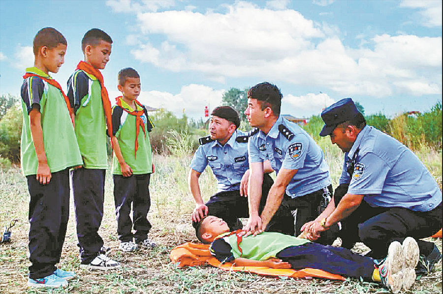 A+ | a5月25日,在新和县塔木托格拉克乡古城湿地,新和县公安局塔木托格拉克派出所开展防溺水宣传教育,通过讲解防溺水知识,现场演练遇险处理、应急救护等,帮助师生增强防溺水意识,提升溺水自救互救能力。图为民警向辖区小学生演示如何进行心肺复苏急救。 麦麦提·萨木萨克 摄