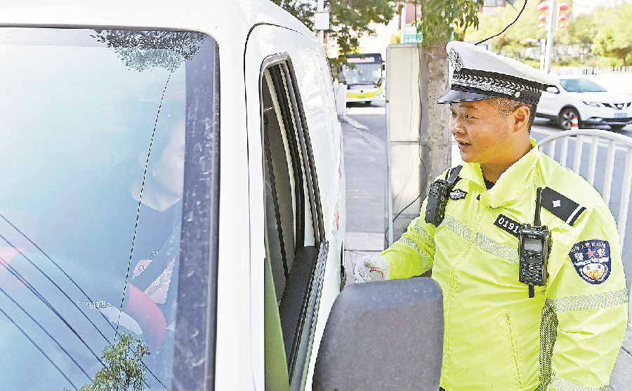 6月3日,乌鲁木齐市公安局交警支队快速路大队外环路中队民警王新源对插队的驾驶人进行批评教育。