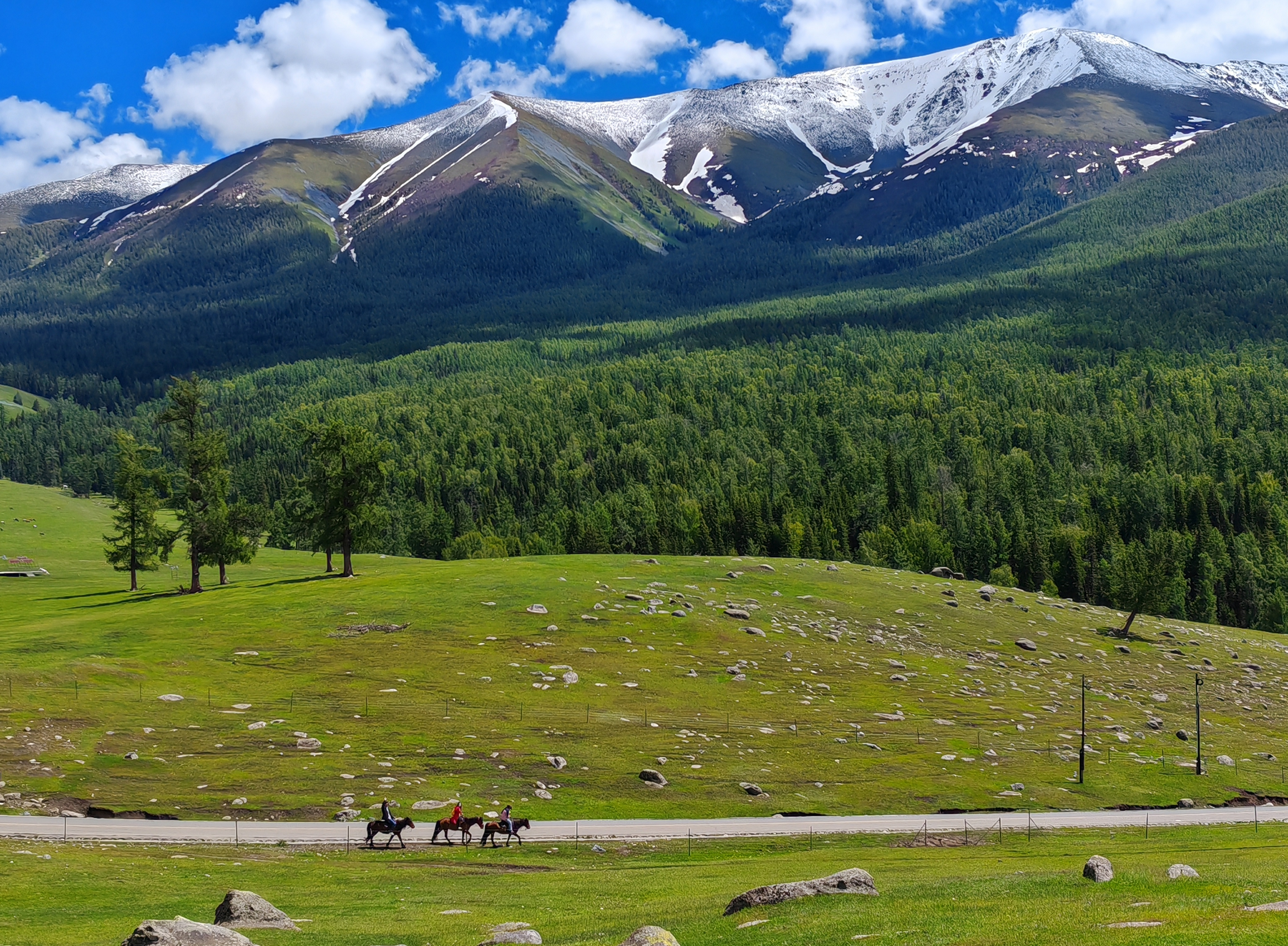 6月4日,游客在哈巴河县骑马游玩。电视剧《我的阿勒泰》播出后,剧集取景地新疆阿勒泰地区最近迎来客流高峰。“张凤侠的小卖部”“巴太树”“彩虹布拉克”等剧中地点成为新的热门旅游打卡地。□新华社记者苟立锋摄