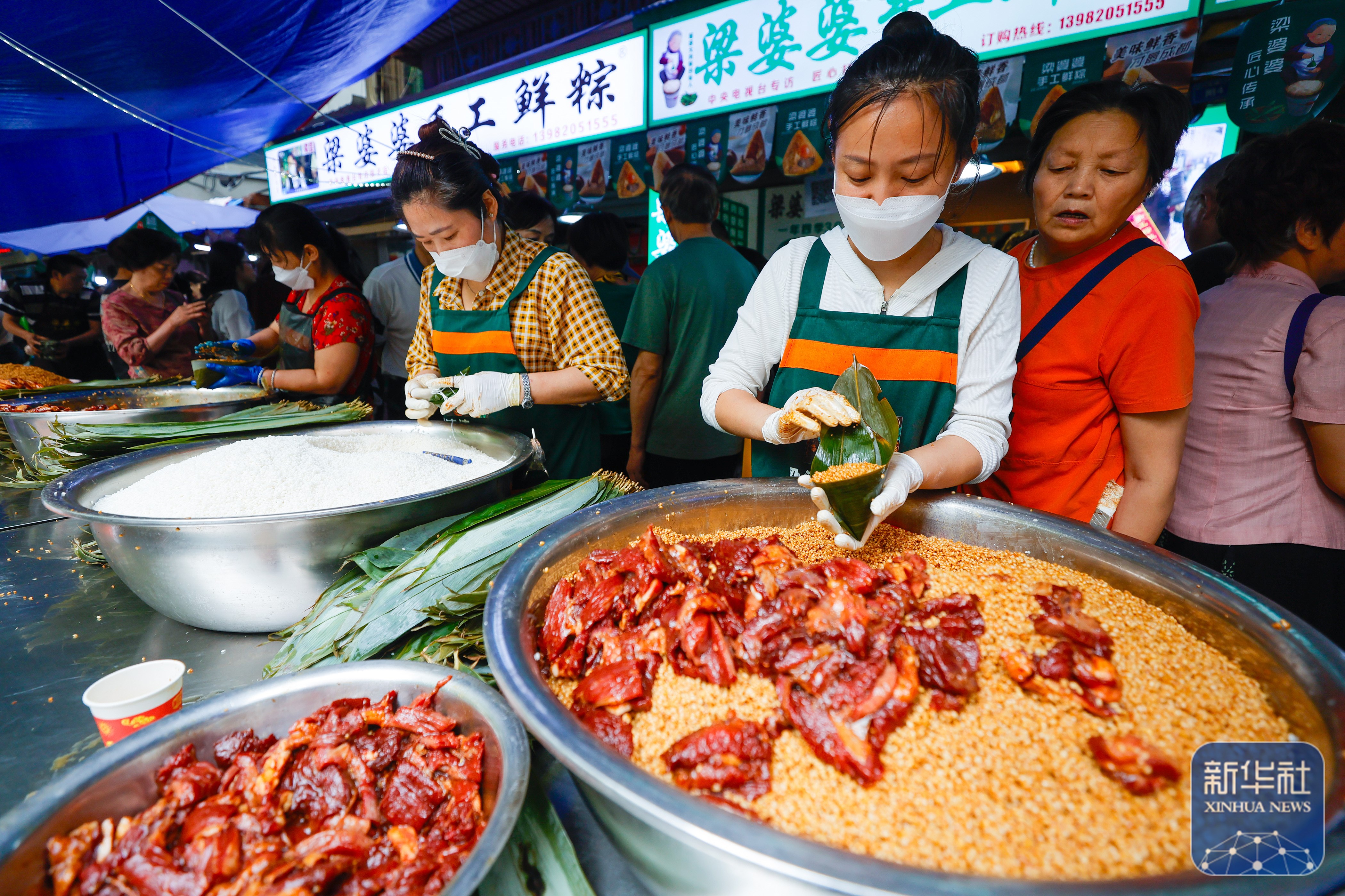 ↑6月7日,在四川省成都市的“粽子一条街”上,一家粽子店的工作人员在包特色肉粽子。新华社记者 沈伯韩 摄