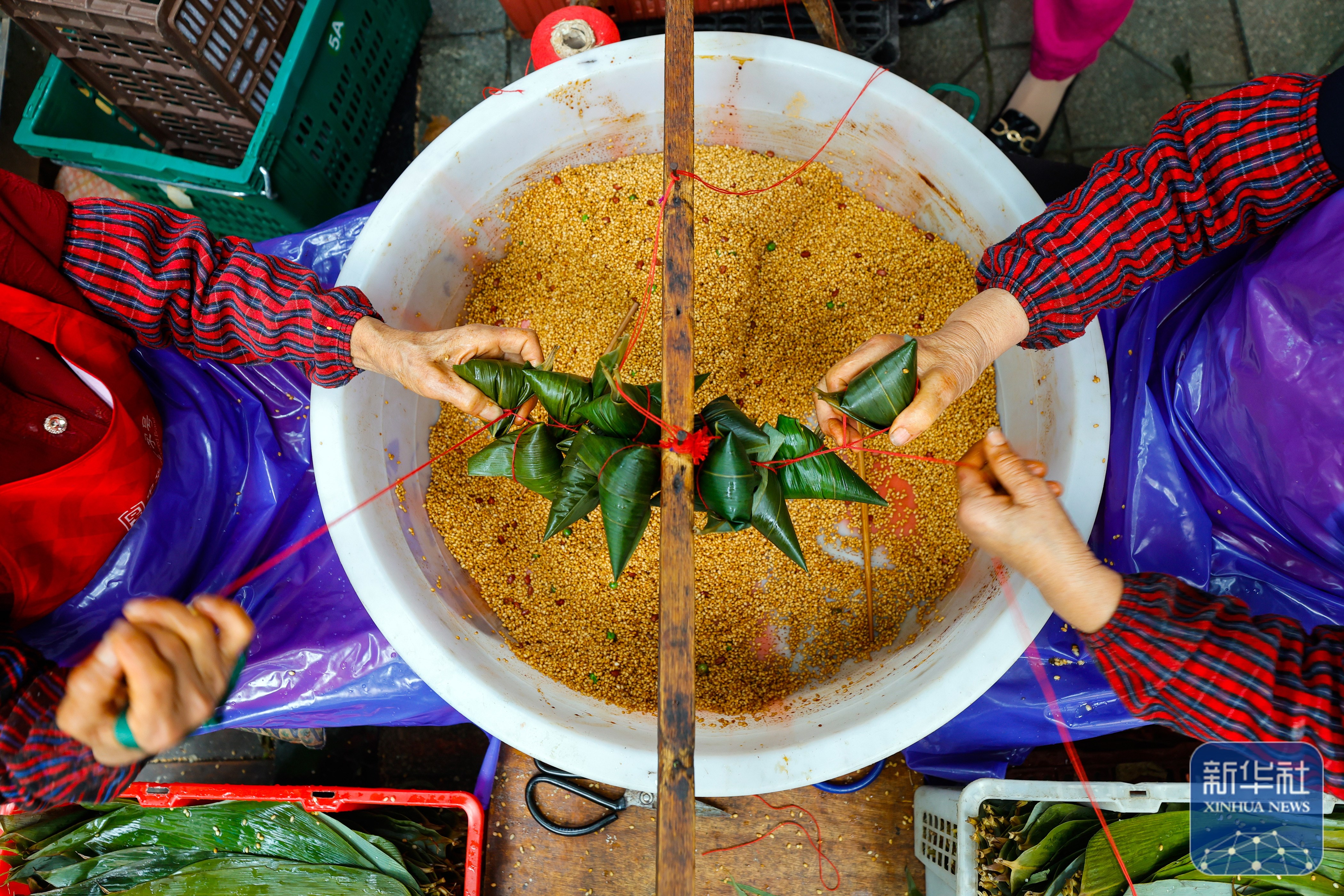 ↑6月7日,在四川省成都市的“粽子一条街”上,一家粽子店的工作人员在包粽子。新华社记者 沈伯韩 摄