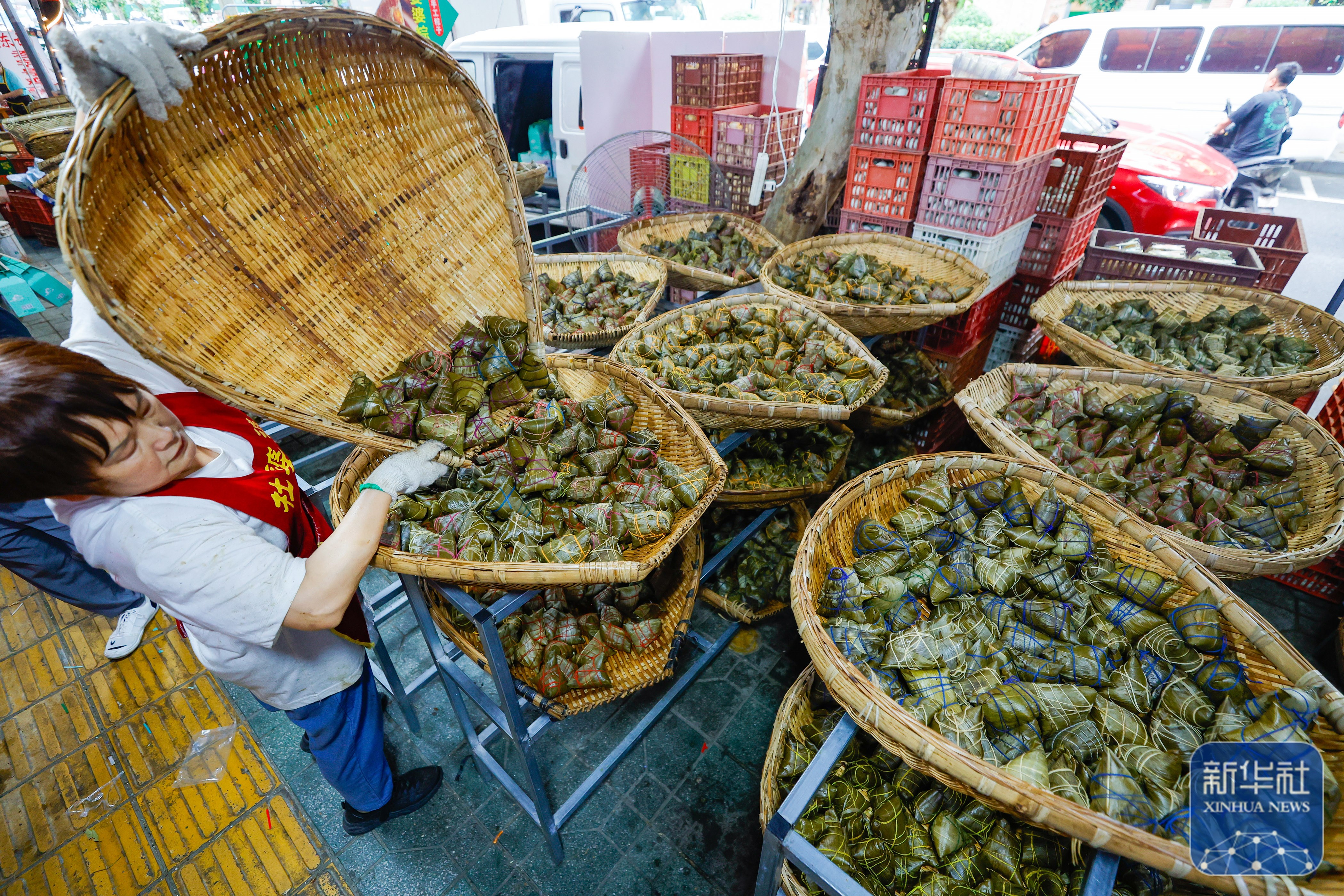 ↑6月7日,在四川省成都市的“粽子一条街”上,一家粽子店的工作人员在摆放做好的粽子。新华社记者 沈伯韩 摄