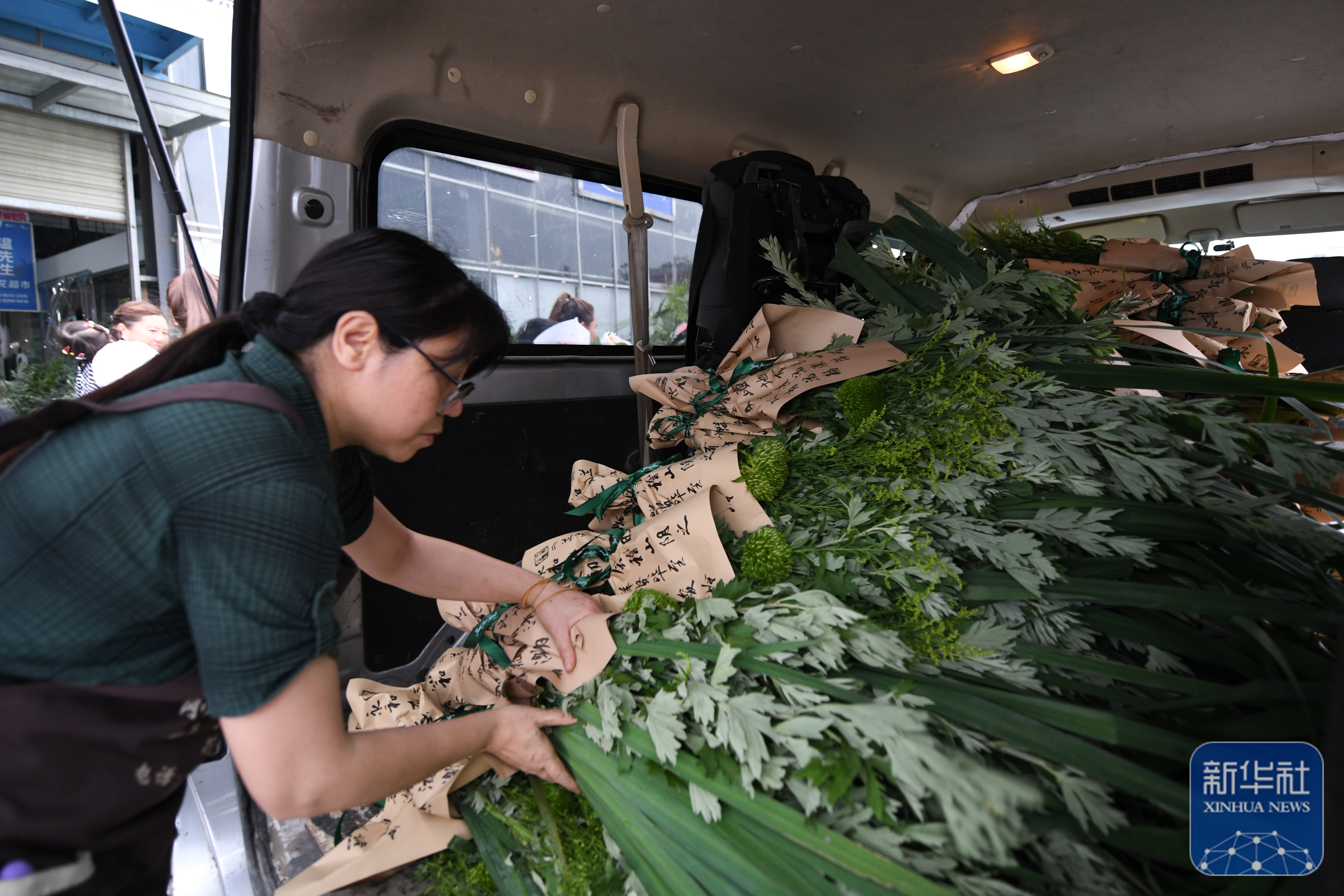 ↑6月6日,在四川省成都市郫都区的一家花店,店员将包扎好的艾草花束装车为客户送出。新华社记者 胥冰洁 摄