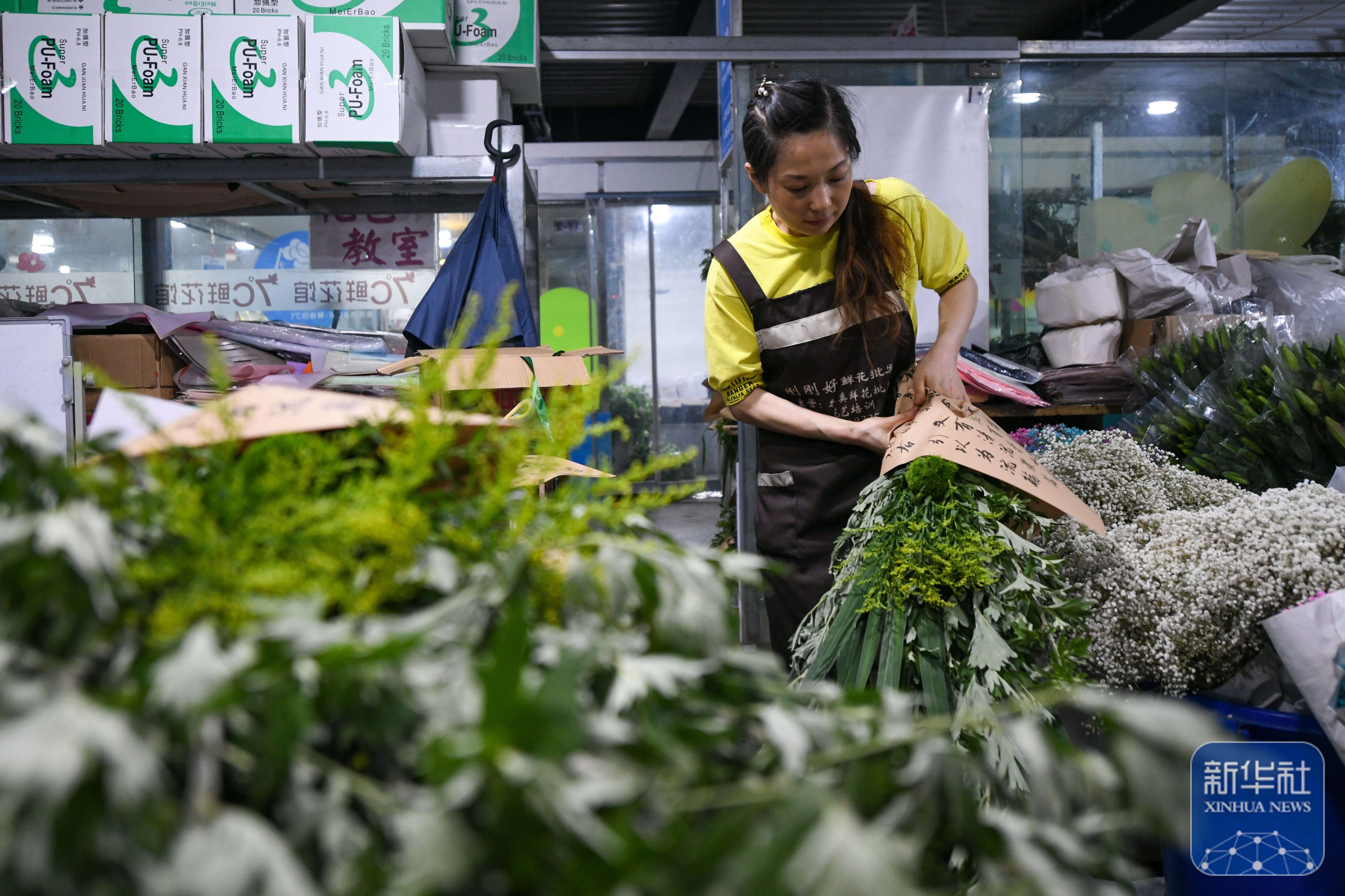 ↑6月6日,在四川省成都市郫都区的一家花店,店主在制作客户订购的艾草花束。新华社记者 胥冰洁 摄