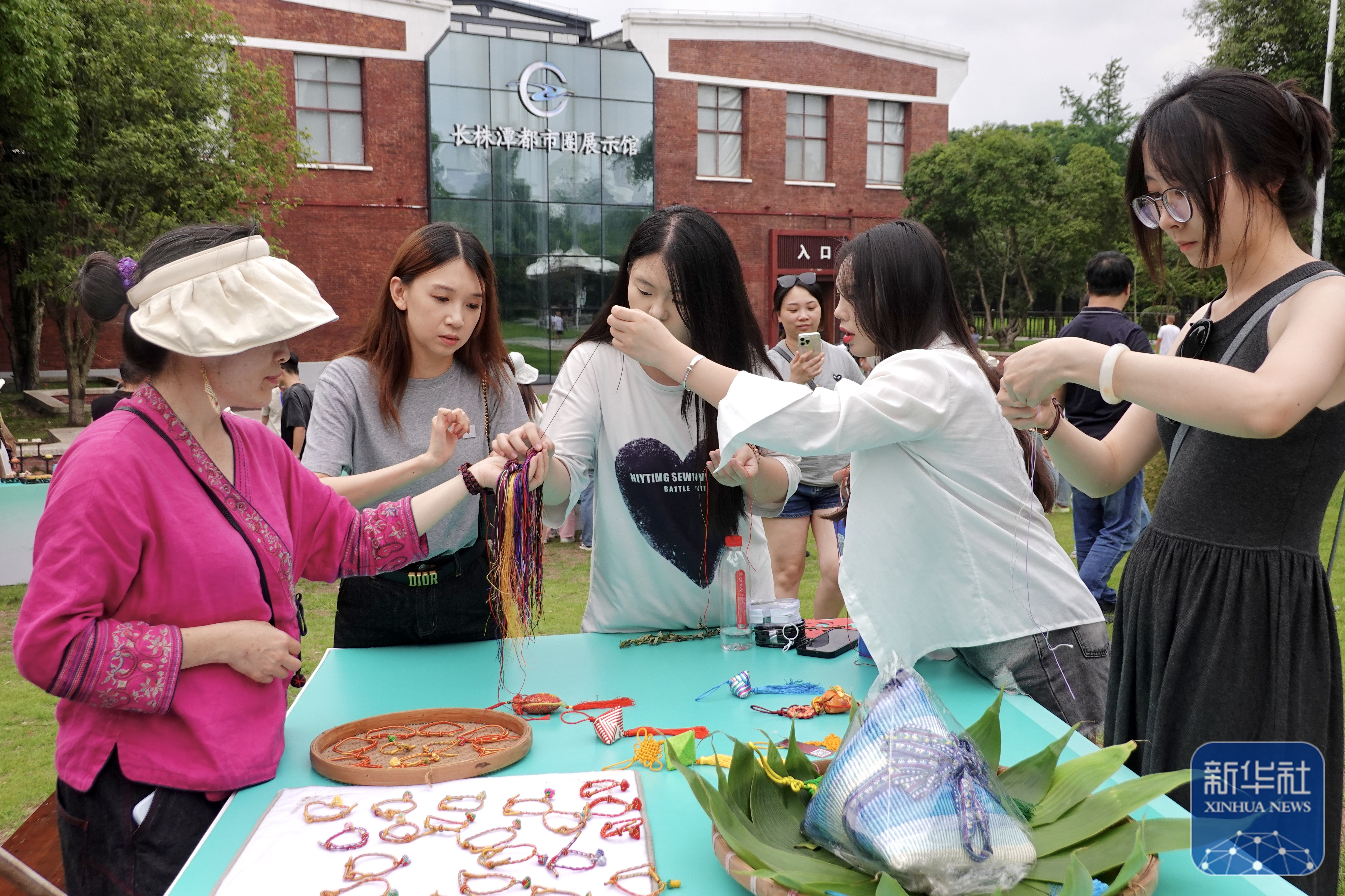 ↑6月7日,在湖南省长沙市的橘子洲景区,市民、游客在体验编织五彩绳,寓意祈福纳吉。新华社记者 张格 摄