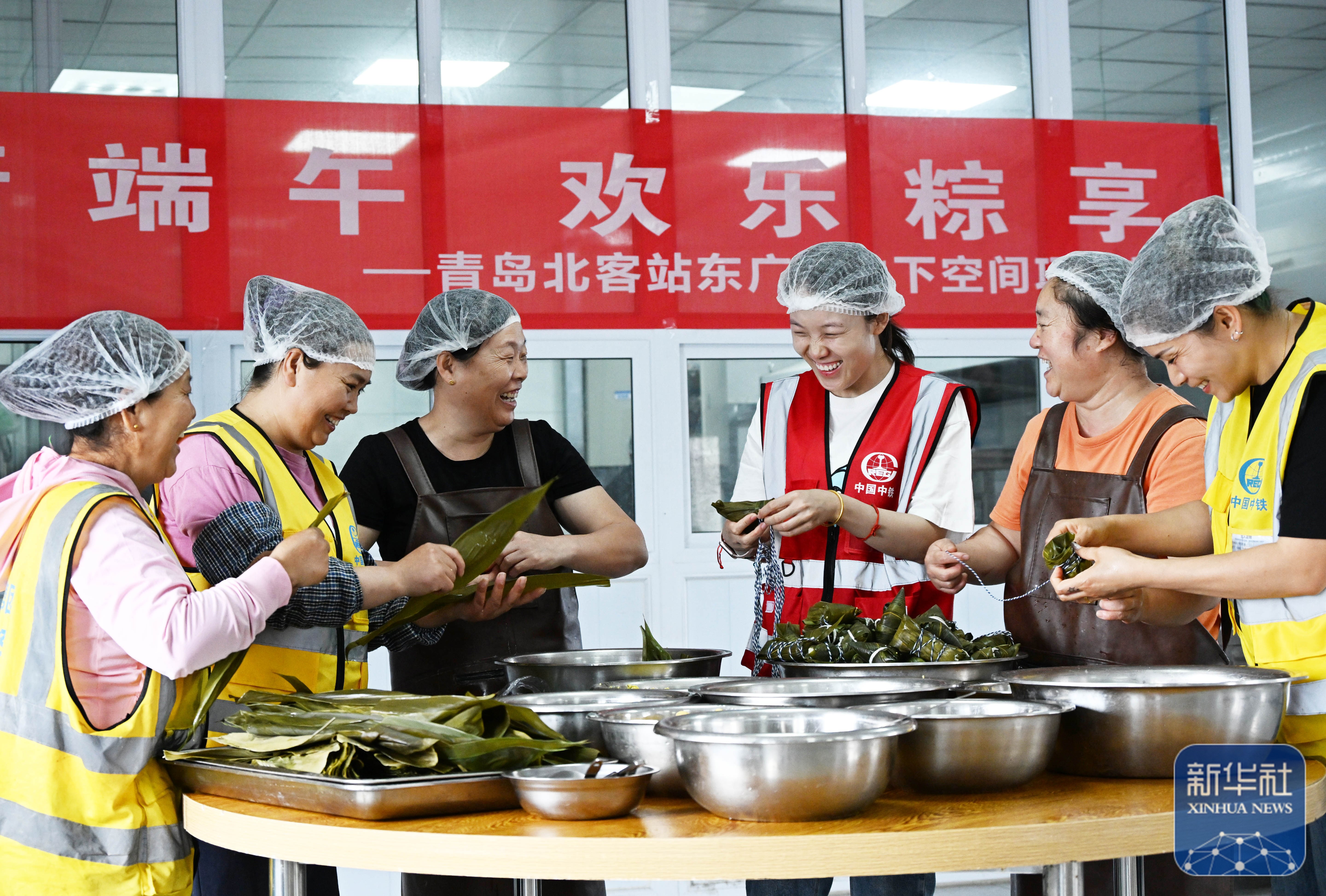 ↑6月7日,在山东省青岛市,中铁建工青岛北客站一项目部的职工在一起包粽子。新华社记者 李紫恒 摄