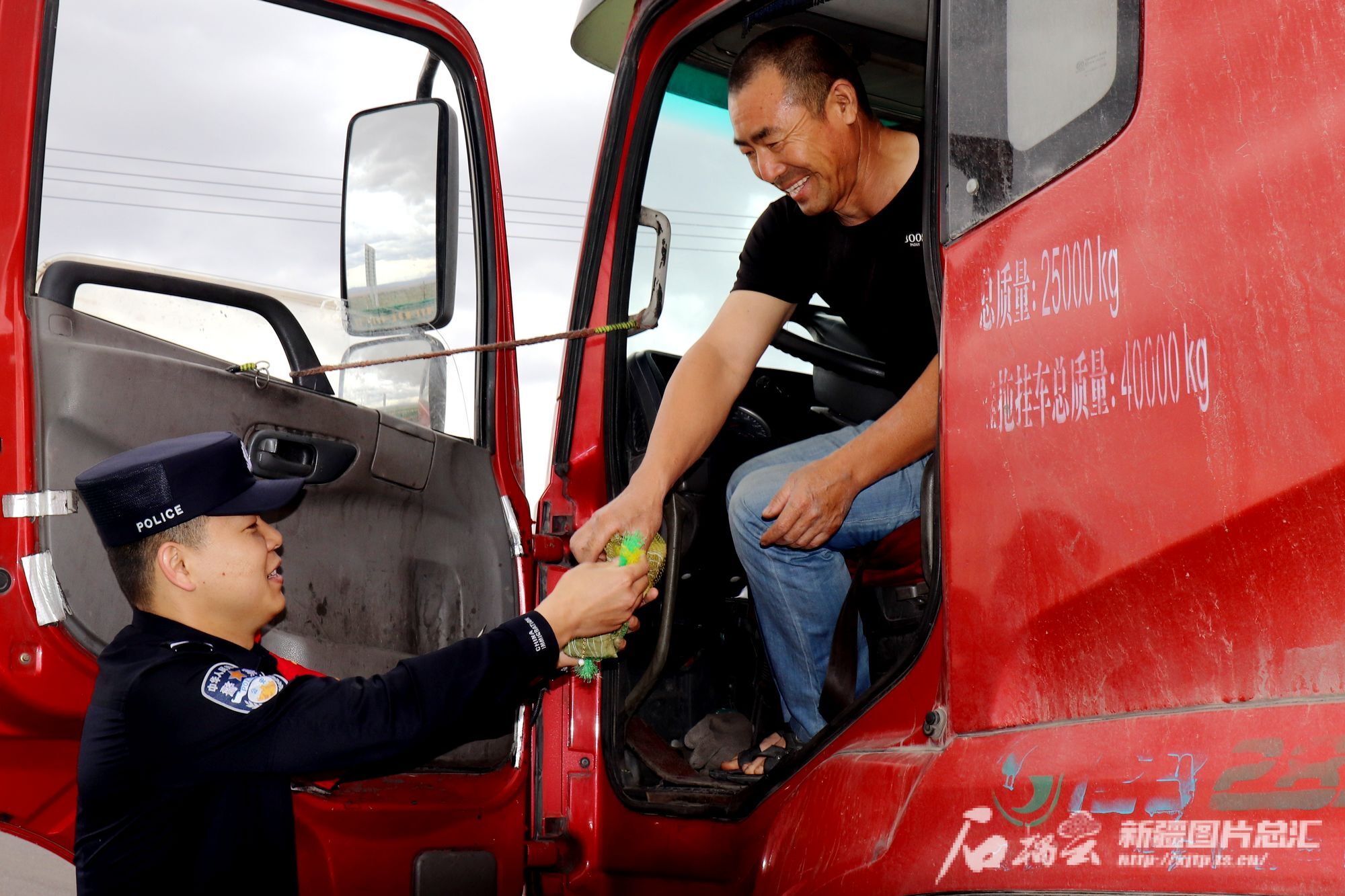 6月8日,在新疆出入境边防检查总站哈密边境管理支队马王庙边境检查站,“驿心红”党员服务队为过往货运司机送上手工粽子和中药香囊。岳朝伟摄