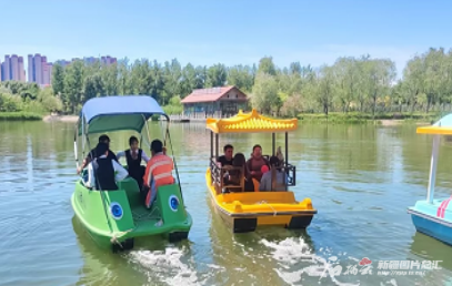 端午佳节来临之际,乌鲁木齐市天山区大湾街道在天山公园开展端午节活动,邀请居民们参与龙舟比赛、歌舞表演、包粽子等活动。图/大湾街道提供