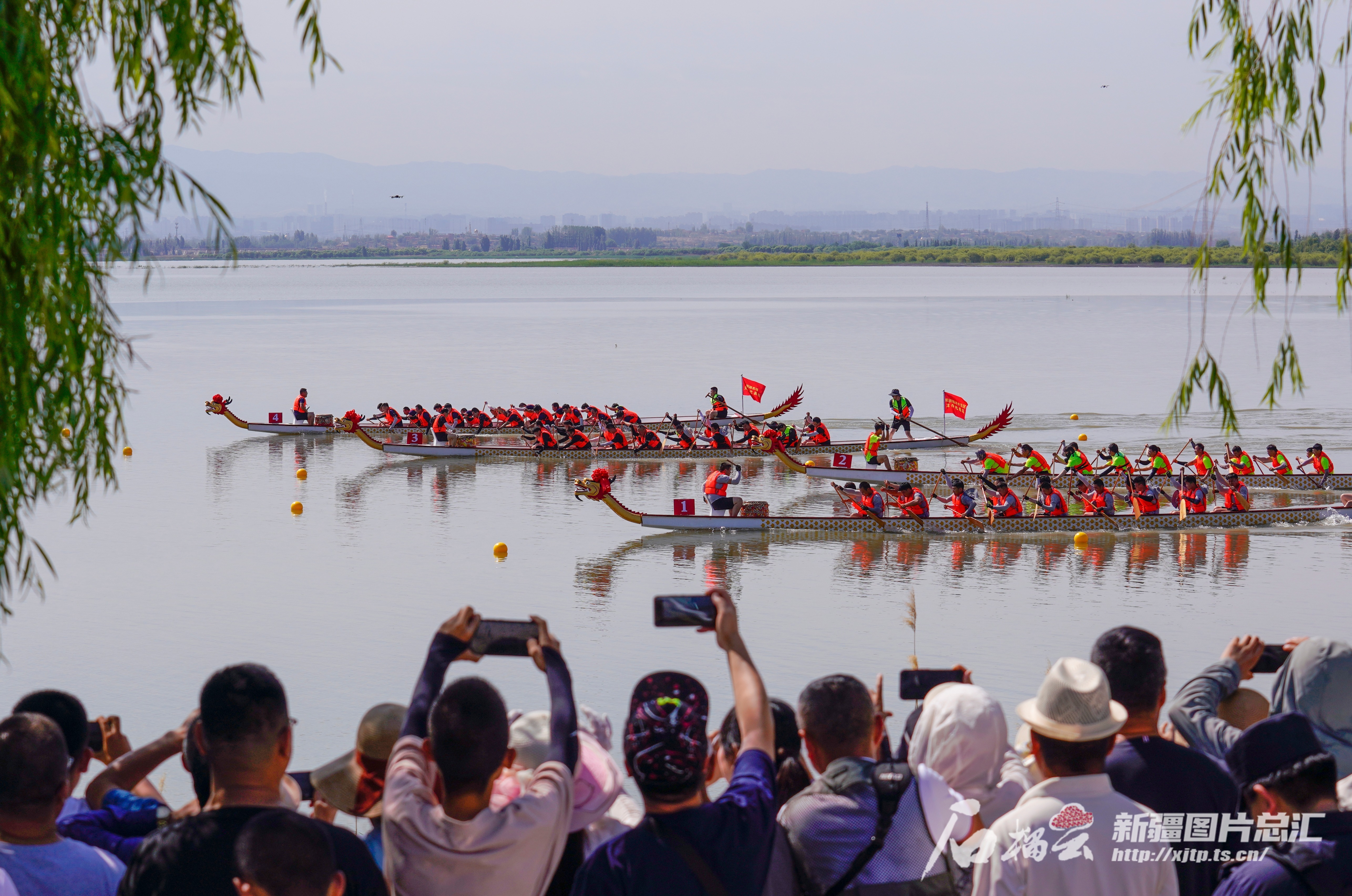6月8日上午,在五家渠青格达湖旅游风景区,新疆生产建设兵团第六师五家渠市举办第二届龙舟赛。图为龙舟赛现场。天山网-新疆日报记者 杨伟摄