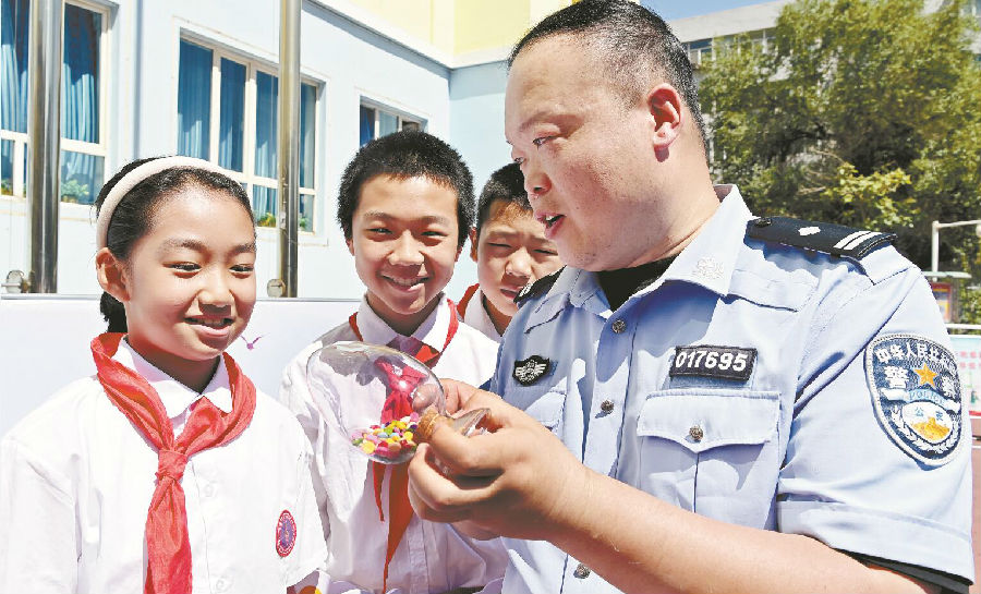 6月6日,乌鲁木齐市公安局沙依巴克区分局友好南路派出所民警杨安华给学生讲解毒品危害。当日,该所与沙区友好南路街道办事处鸿雁社区在乌市第89中学联合开展禁毒宣传进校园活动。民警通过展示毒品仿真模型,向学生们介绍毒品的种类、特征及拒毒方法,鼓励大家积极提供涉毒线索,共同营造绿色无毒环境。 石榴云/新疆法治报记者 单坤 摄
