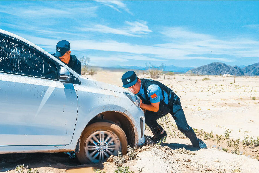 6月3日,新疆出入境边防检查总站克州边境管理支队依达良边境派出所民警在克鲁木都克山口附近无人区救助被困车辆。当日,该所民警接到群众求助后,立即携带铁锹、拖车绳等工具赶往事发地,通过人推车拽方式帮被困车辆脱困。 缪应传 摄