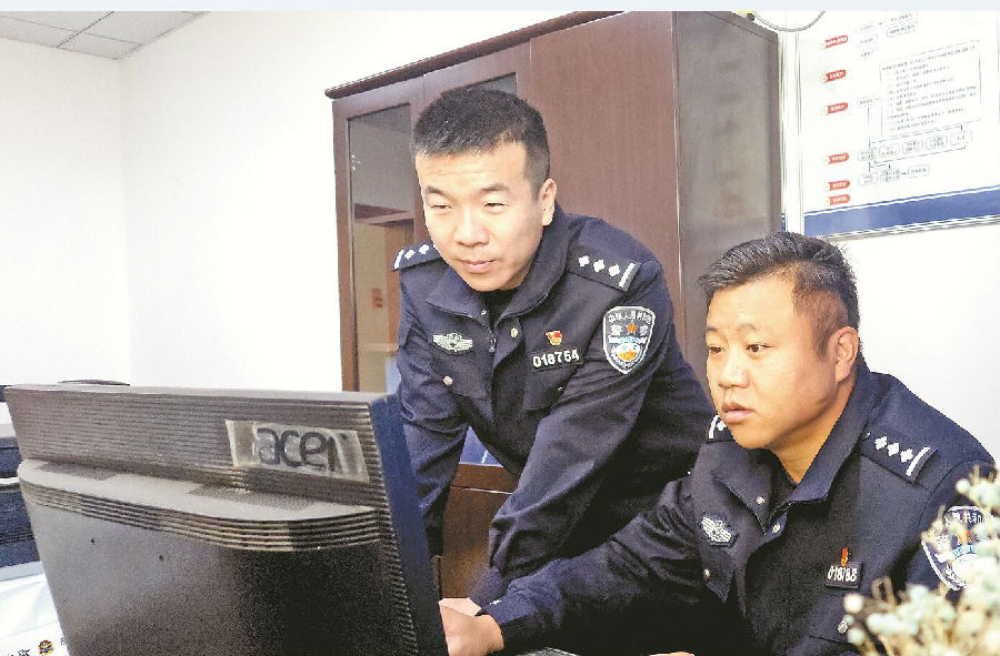 二月,段志勇(右)和同事研究分析网络赌博案件信息。 何新 摄