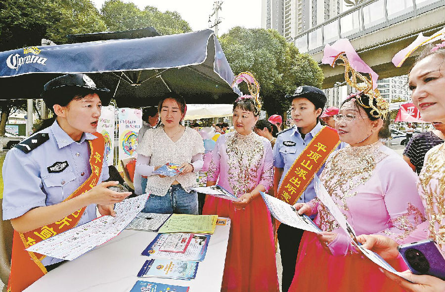 工作人员通过悬挂横幅、摆放宣传展板、发放宣传资料等方式,向群众普及安全知识,并与群众“面对面”交流、答疑解惑,增强群众的安全意识和法治意识。图为平顶山派出所民辅警给群众讲解电信网络诈骗手段,提醒群众不要上当受骗。 石榴云/新疆法治报记者 单坤 摄