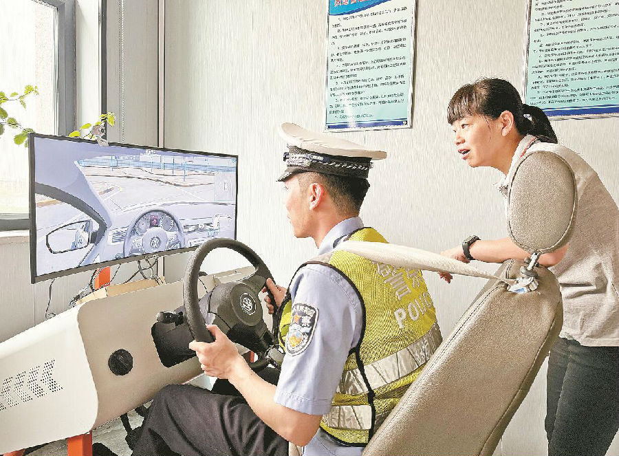奇台县公安局交警大队民警利用模拟车讲解驾车注意事项。 钮芬 摄