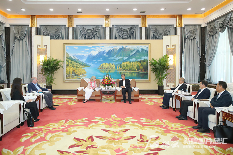6月21日,自治区党委书记马兴瑞、自治区主席艾尔肯·吐尼亚孜在乌鲁木齐会见来新疆参访的加拿大驻华大使梅倩琳。天山网-新疆日报记者 崔志坚摄