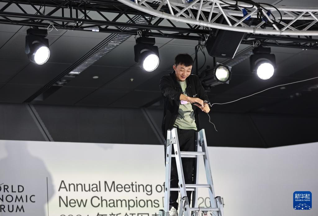 6月24日,工作人员在夏季达沃斯论坛主会场大连国际会议中心调试灯光。新华社记者 杨青 摄