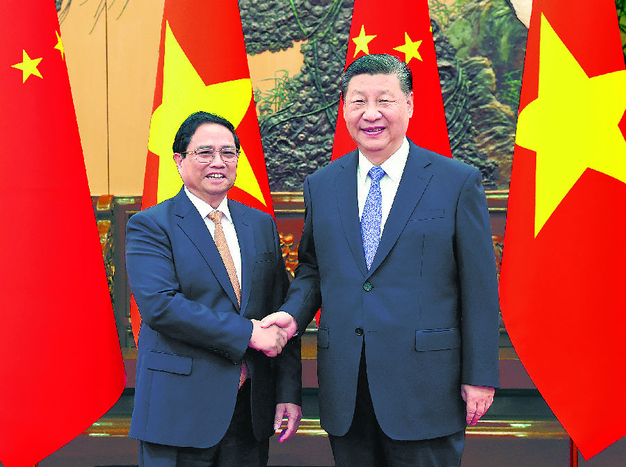 6月26日下午,国家主席习近平在北京人民大会堂会见来华出席夏季达沃斯论坛的越南总理范明政。 新华社记者 姚大伟 摄