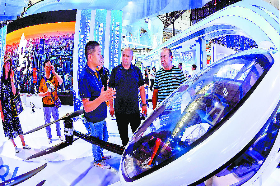6月27日,客商在乌鲁木齐市展位上了解无人驾驶载人航空器。