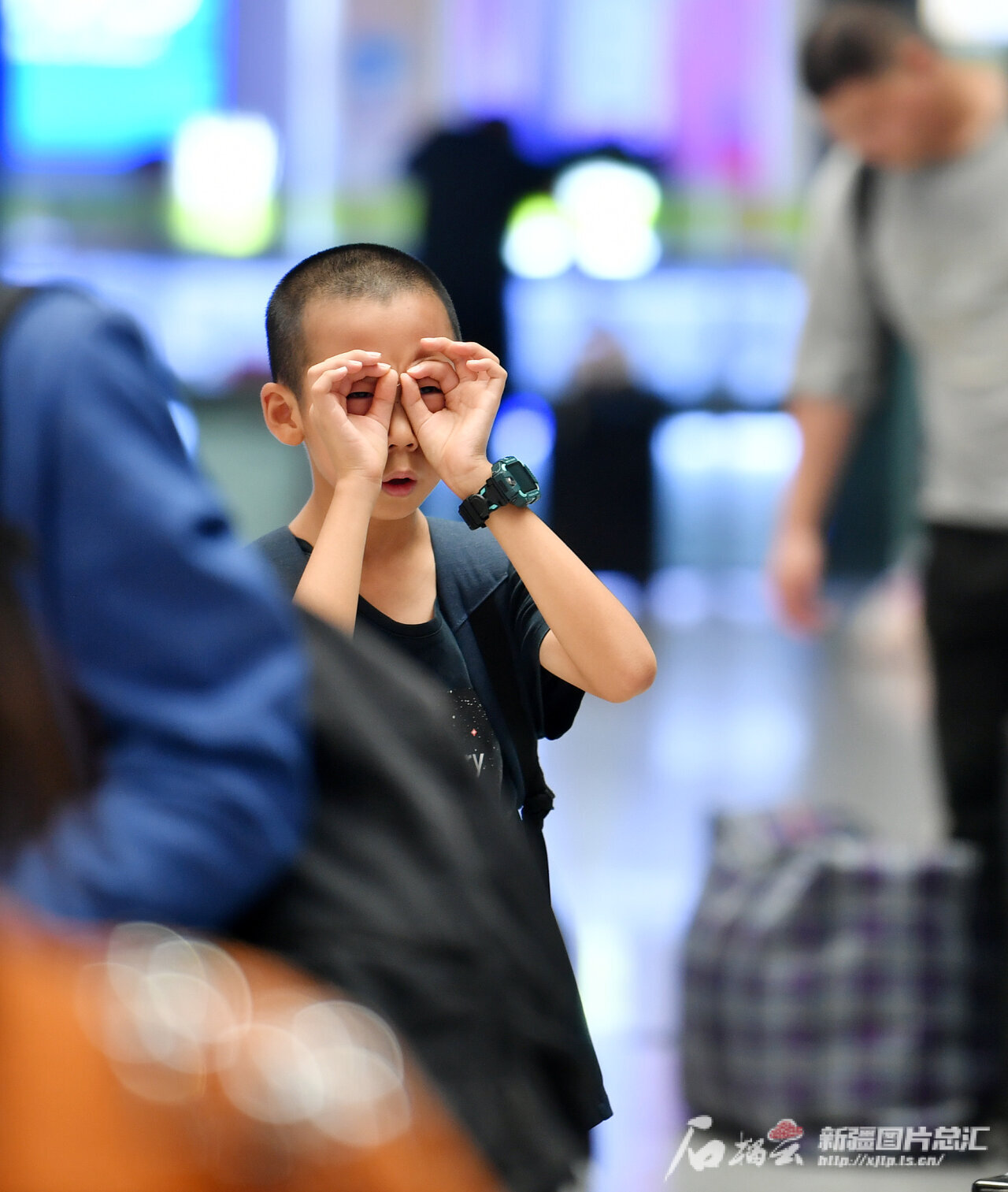 7月1日,小旅客在乌鲁木齐站候车大厅观看电子大屏上的信息。
