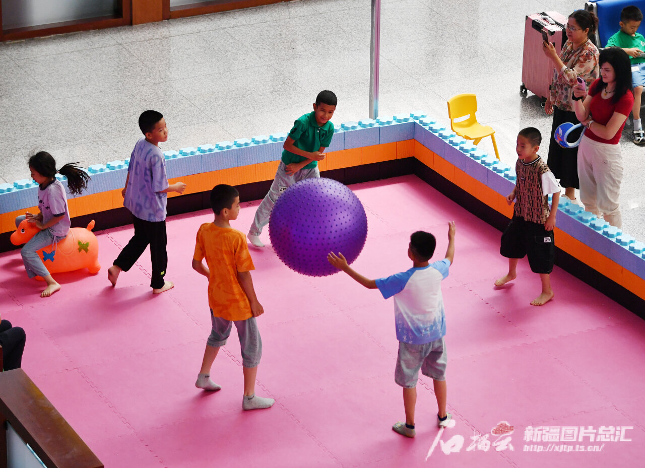 7月1日,小旅客在乌鲁木齐站儿童活动区做游戏。