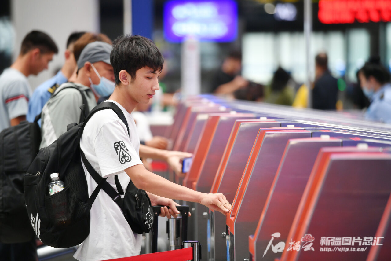 7月1日,旅客在乌鲁木齐站通过闸机,准备登车。