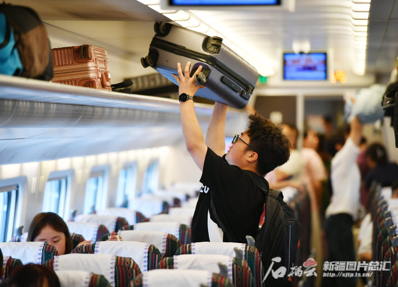 7月1日,旅客从乌鲁木齐站登车后放置行李。