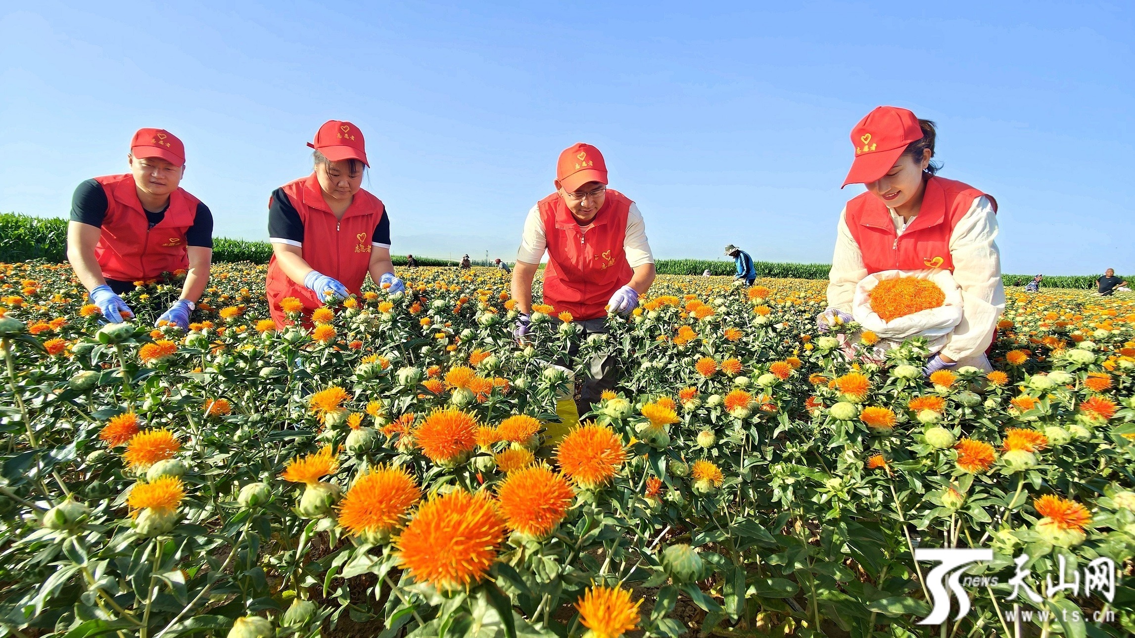 7月1日,伊犁哈萨克自治州纪委监委驻察布查尔锡伯自治县海努克镇向阳村工作队队员和村“两委”干部帮助花农采摘红花。华岩明 摄