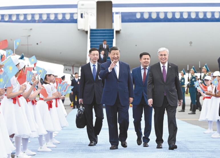 托卡耶夫在机场为习近平举行盛大隆重的迎宾仪式。100余名仪仗兵英姿挺拔,军乐团奏响迎宾曲和迎宾号角。近百名哈萨克斯坦儿童挥舞中哈两国国旗,欢呼“您好”,热烈欢迎习近平到访。