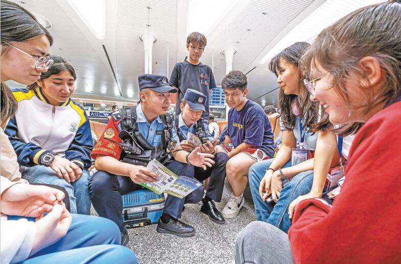 2024年暑运7月1日正式启动。为做好暑运工作,乌鲁木齐铁路公安局乌鲁木齐公安处加强对各类违法犯罪行为的打击整治及铁路安全隐患排查力度,对各类警情快速反应、妥善处置,守护旅客出行安全和铁路运输畅通。图为民警向返家学生讲解乘车注意事项。