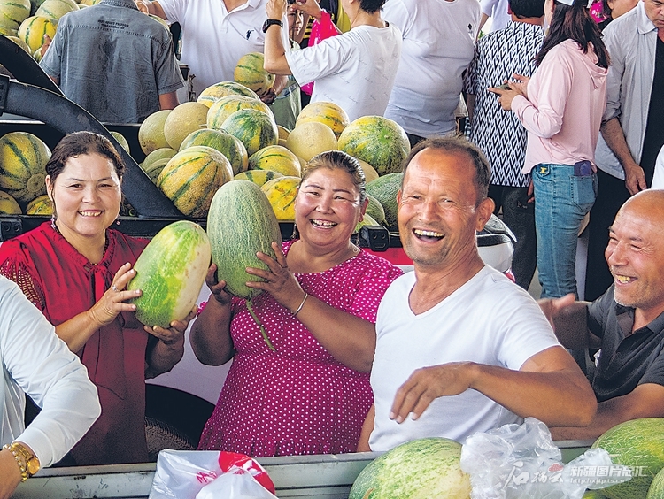 7月2日,莎车县荒地镇布瓦库木村村民在展示甜瓜。当日,该镇举办第八届甜瓜节,种植户带着自己种植的甜瓜来到活动现场展示销售。张昀摄
