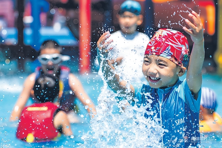 7月2日,小朋友在昌吉市人民公园内的水上乐园戏水玩耍。何龙摄