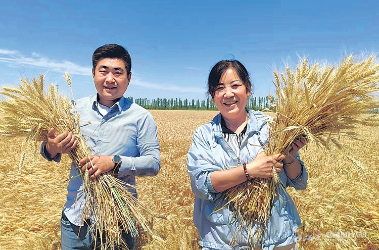 7月3日,吉木萨尔县二工镇董家湾村村民手捧成熟的小麦,丰收的喜悦洋溢在脸上。张德峰摄
