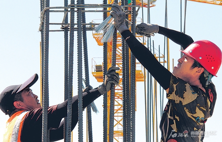 7月3日,工人在裕民县新建第一中学建设项目现场作业。该项目总投资1.03亿元,包括教学楼、综合楼及配套附属设施,预计年底建成投用。杨化光摄