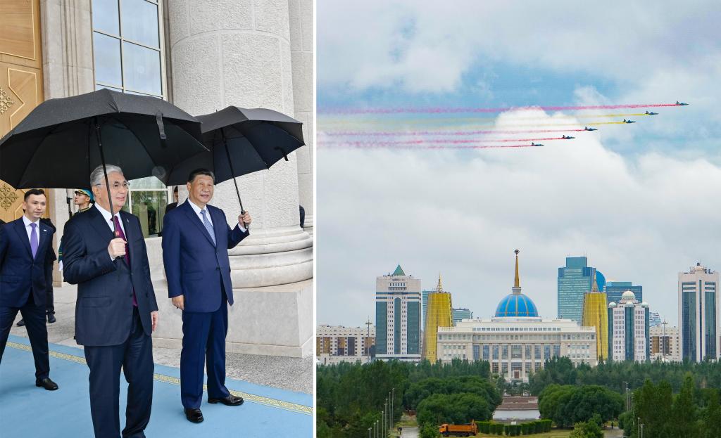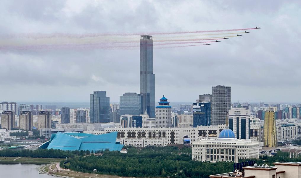 A+ | a当地时间7月3日,国家主席习近平在阿斯塔纳出席哈萨克斯坦总统托卡耶夫举行的欢迎仪式。习近平乘车抵达总统府时,托卡耶夫总统热情迎接。六架哈萨克斯坦空军战机从总统府上空飞过,拉出象征中国国旗的红黄色彩烟,以最高礼仪欢迎习近平对哈萨克斯坦进行国事访问。