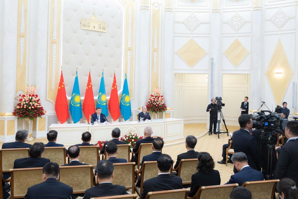 习近平在阿斯塔纳总统府同托卡耶夫共同会见记者。