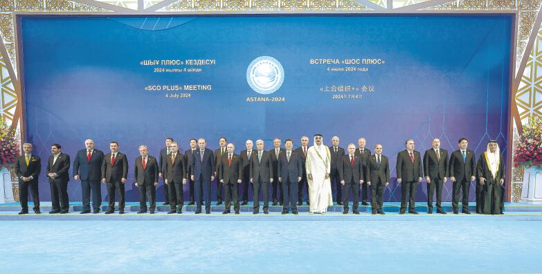 当地时间7月4日下午,国家主席习近平在阿斯塔纳出席“上海合作组织+”阿斯塔纳峰会并发表题为《携手构建更加美好的上海合作组织家园》的重要讲话。 新华社记者 庞兴雷 摄